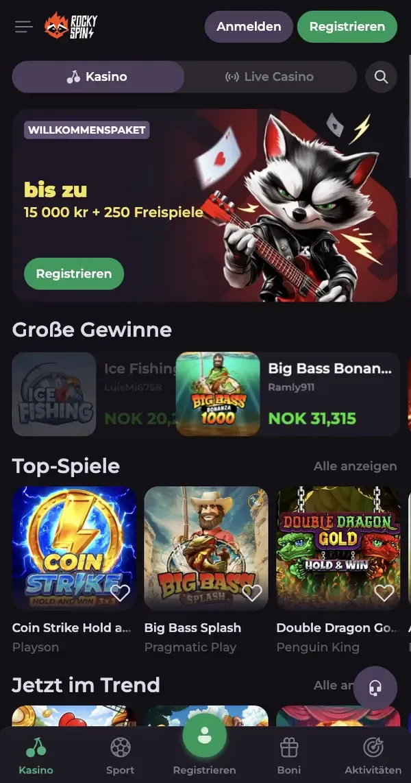 Mobil können Sie die komplette Spielebibliothek durchsuchen, Spiele je nach Titel im Hoch- oder Querformat starten und Filter nutzen, um das Passende zu finden. Wir bieten rund 6000 Spiele aus Slots, Roulette, Blackjack, Baccarat, Video Poker, Bingo, Keno, Rubbellosen, Crash-Games und Live-Casino. Sport- und eSports-Wetten sind ebenfalls über dasselbe Konto verfügbar – Sie brauchen keine getrennten Wallets. Unser RockySpin Mobile-App-Erlebnis wird über den Browser bereitgestellt, hält die Navigation aber dennoch einfach und gut lesbar auf kleineren Displays.
